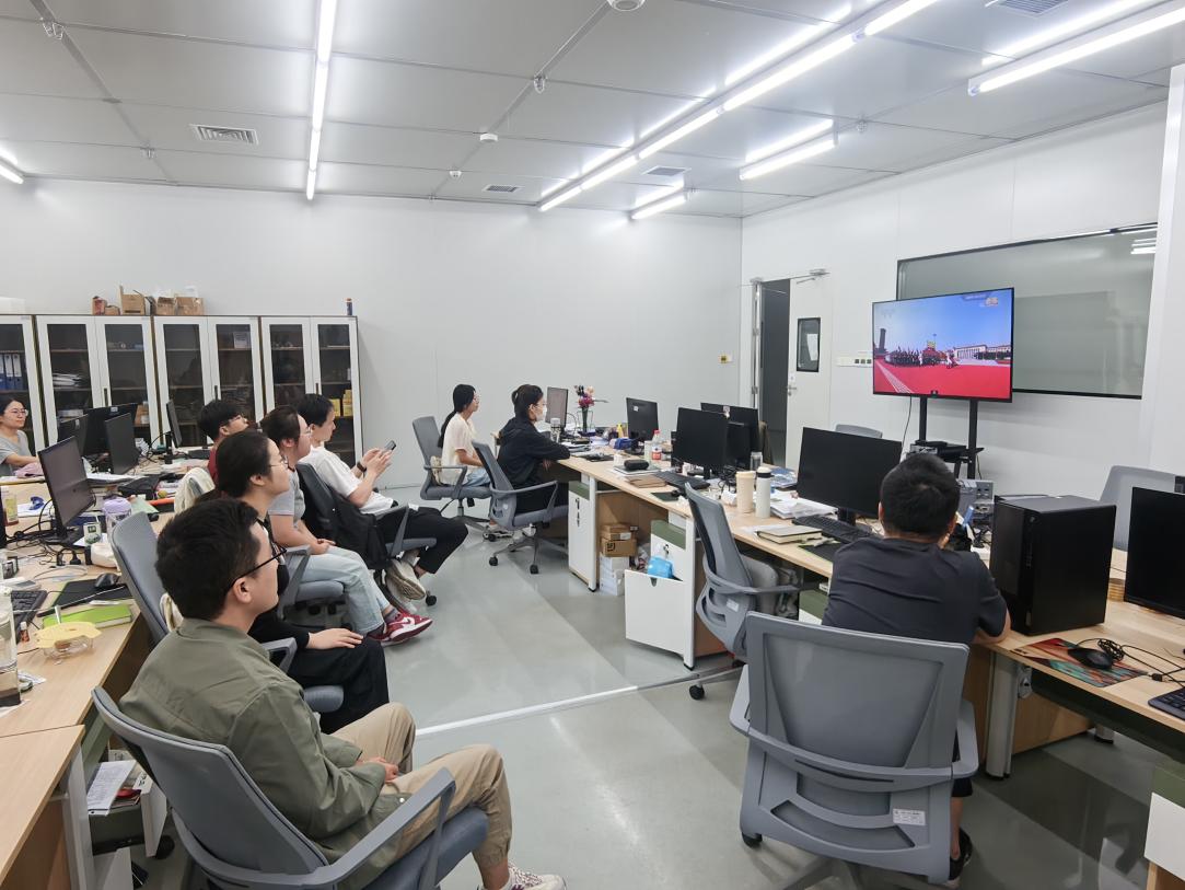我院全体员工观看纪念中国人民抗日战争暨世界反法西斯 战争胜利80周年大会 为铭记光辉历史,缅怀革命先烈,弘扬爱国主义精神,9月3日上午,山西北大碳基薄膜电子研究院人力资源部组织全体员工观看了纪念中国人民抗日战争暨世界反法西斯战争胜利80周年阅兵式直播,共同见证这一庄严而振奋人心的历史时刻。 观看现场气氛庄重而热烈。当天一早,员工们便满怀期待地提前来到会场,等待仪式开始。当直播画面中传来激昂雄壮的国歌声、展现出受阅部队英姿飒爽的阵容时,所有到场员工目光都聚焦于大屏幕,沉浸在那庄严而震撼的氛围之中。 阅兵过程中,受阅部队步伐铿锵、军容严整,新型装备和空中梯队依次亮相,全方位展现了国家强大的国防力量和现代化建设的辉煌成就,完美诠释了听党指挥、能打胜仗、作风优良的精神风貌,会场多次引发热烈掌声 。员工们纷纷表示,看到祖国的强大,感到无比自豪和骄傲。 阅兵式结束后,员工们心潮澎湃,难掩激动之情。此次阅兵仪式不仅是一场视觉盛宴,更是一次深刻的精神洗礼和爱国主义教育,旨在激励员工以更加饱满的热情和昂扬的斗志投入到工作中,为研究院的发展和国家的繁荣贡献自己的力量。