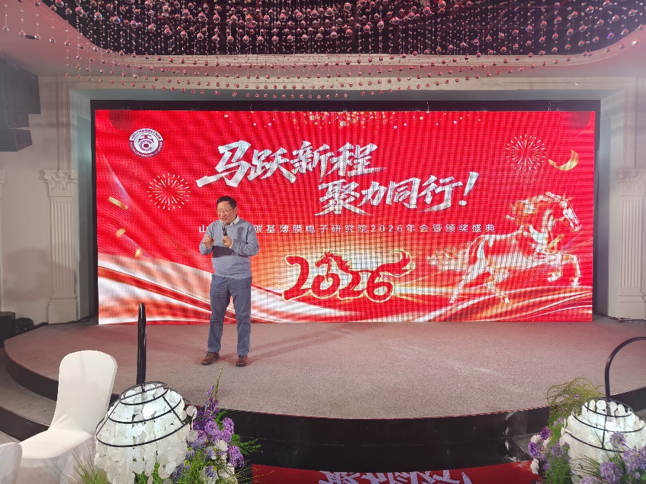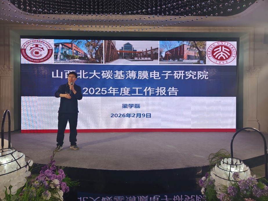 “聚力同行,向新而进” 山西北大碳基薄膜电子研究院2026年会盛典圆满举行 时光镌刻奋进足迹,新程再启发展华章。2026年2月9日,山西北大碳基薄膜电子研究院2026年会盛典隆重举行。研究院全体员工与来自北京大学、北京大学重庆碳基集成电路研究院、北京交通大学、北京邮电大学、太原理工大学及山西大学等科研合作院校及相关单位嘉宾齐聚一堂,在昂扬奋进、团结向上的氛围中共话收获、共谋未来,凝聚迈向新征程的澎湃力量。 擘画蓝图:在总结中积蓄再出发的力量 研究院院长梁学磊首先代表院务委员会向全体来宾和员工做研究院2025年度工作报告,从科研创新突破、重大平台建设、人才队伍壮大到成果转化提速,对过去一年的发展成效进行了系统回顾。2025年,研究院创新动能持续释放、关键任务稳步推进、整体发展迈上新台阶,一批具有标志性的科研进展和平台成果不断涌现,展现出强劲的发展韧性与成长潜力。面向新阶段,研究院将进一步强化原创技术策源能力,深化协同创新体系建设,推动碳基电子技术向更高水平迈进,加快培育具有引领性的创新成果。